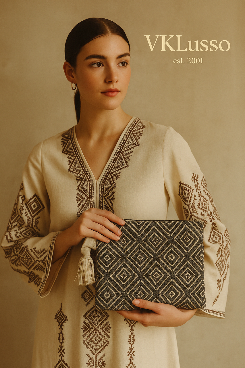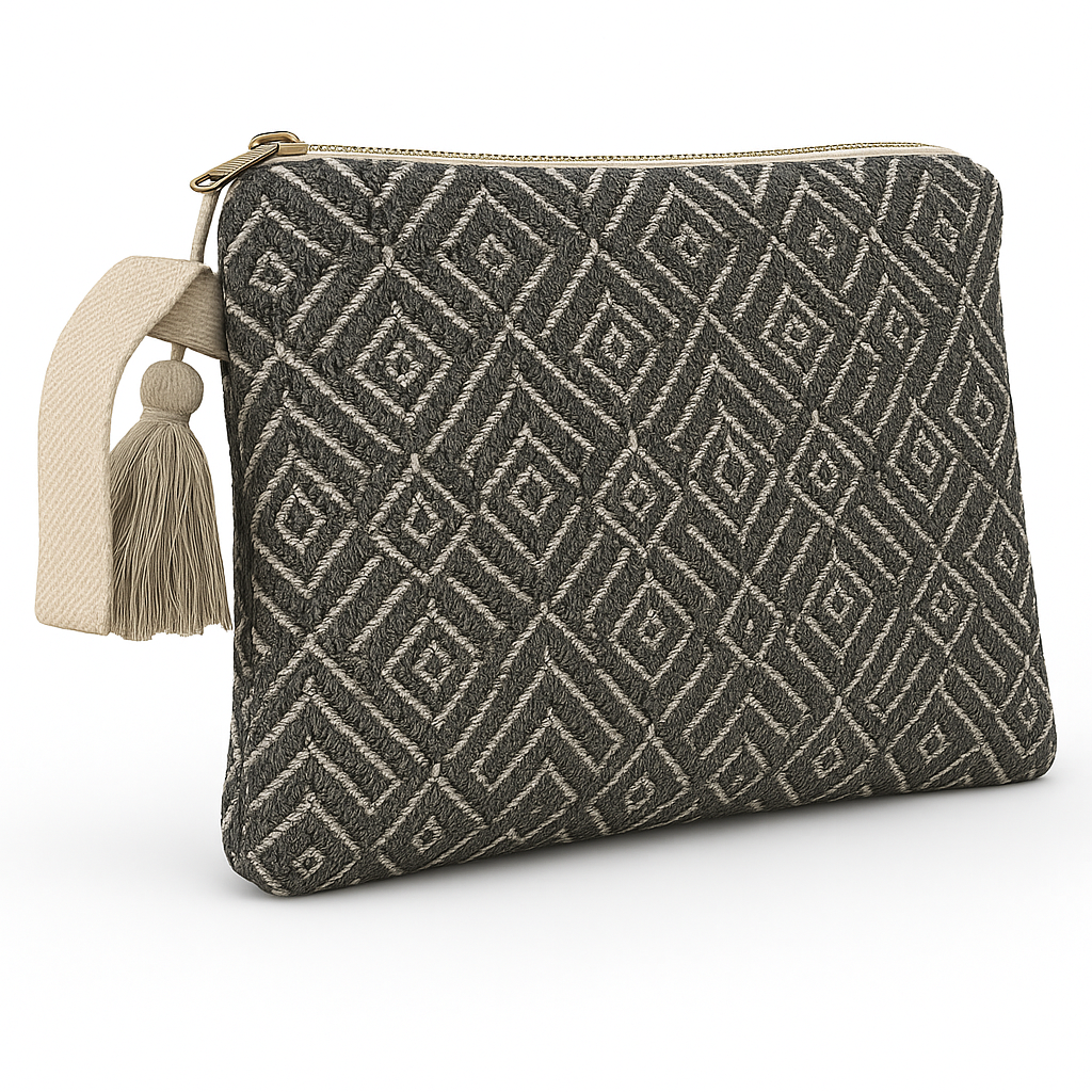 Η τσάντα “Geometric Noir” είναι χειροποίητη, με υφαντό ύφασμα υψηλής ποιότητας και ιδιαίτερο γεωμετρικό μοτίβο σε αποχρώσεις του μαύρου και του εκρού. Η υφασμάτινη φούντα και το χοντρό λουρί σε φυσικό χρώμα προσδίδουν boho chic χαρακτήρα, ενώ ο minimal σχεδιασμός την καθιστά ιδανική για κάθε ώρα της ημέρας.