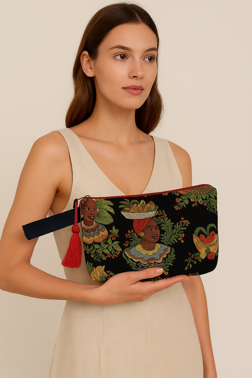Αναδείξτε το στυλ σας με αυτό το μοναδικό χειροποίητο clutch από υφαντό ταπισερί ύφασμα. Διακοσμημένο με τροπικά μοτίβα και ζωντανά χρώματα, είναι ιδανικό για κάθε περίσταση – από βραδινές εξόδους μέχρι καλοκαιρινές αποδράσεις.