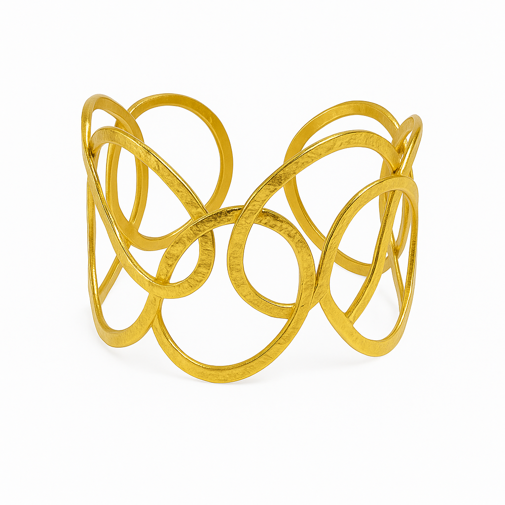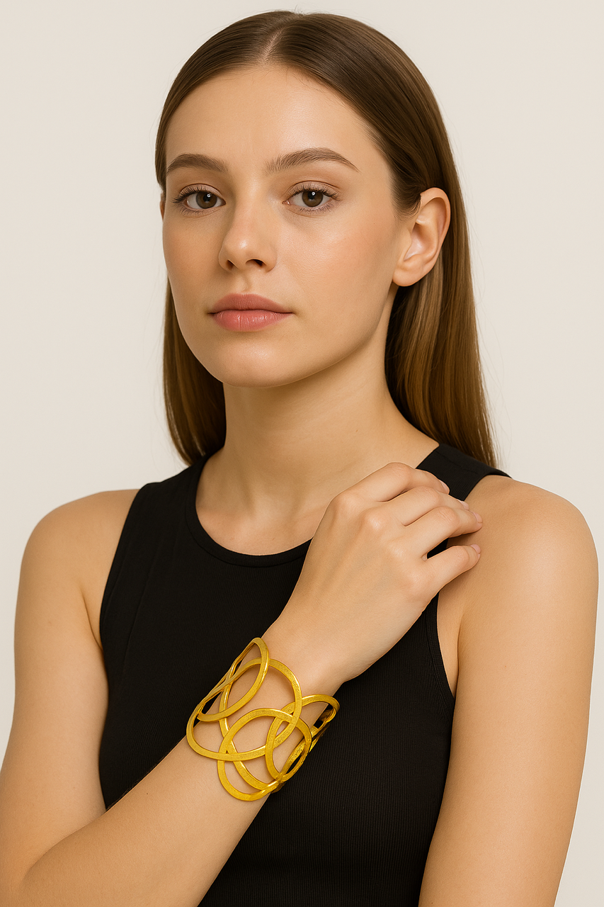 Αυτό το βραχιόλι συνδυάζει την αρμονία των γεωμετρικών κύκλων με τη δυναμική υφή του επιχρυσωμένου μετάλλου. Το ιδιαίτερο design με διασταυρούμενους κρίκους προσδίδει μία σύγχρονη αλλά και διαχρονική αισθητική. Ιδανικό για κάθε εποχή και κάθε περίσταση που χρειάζεται λίγη παραπάνω λάμψη.