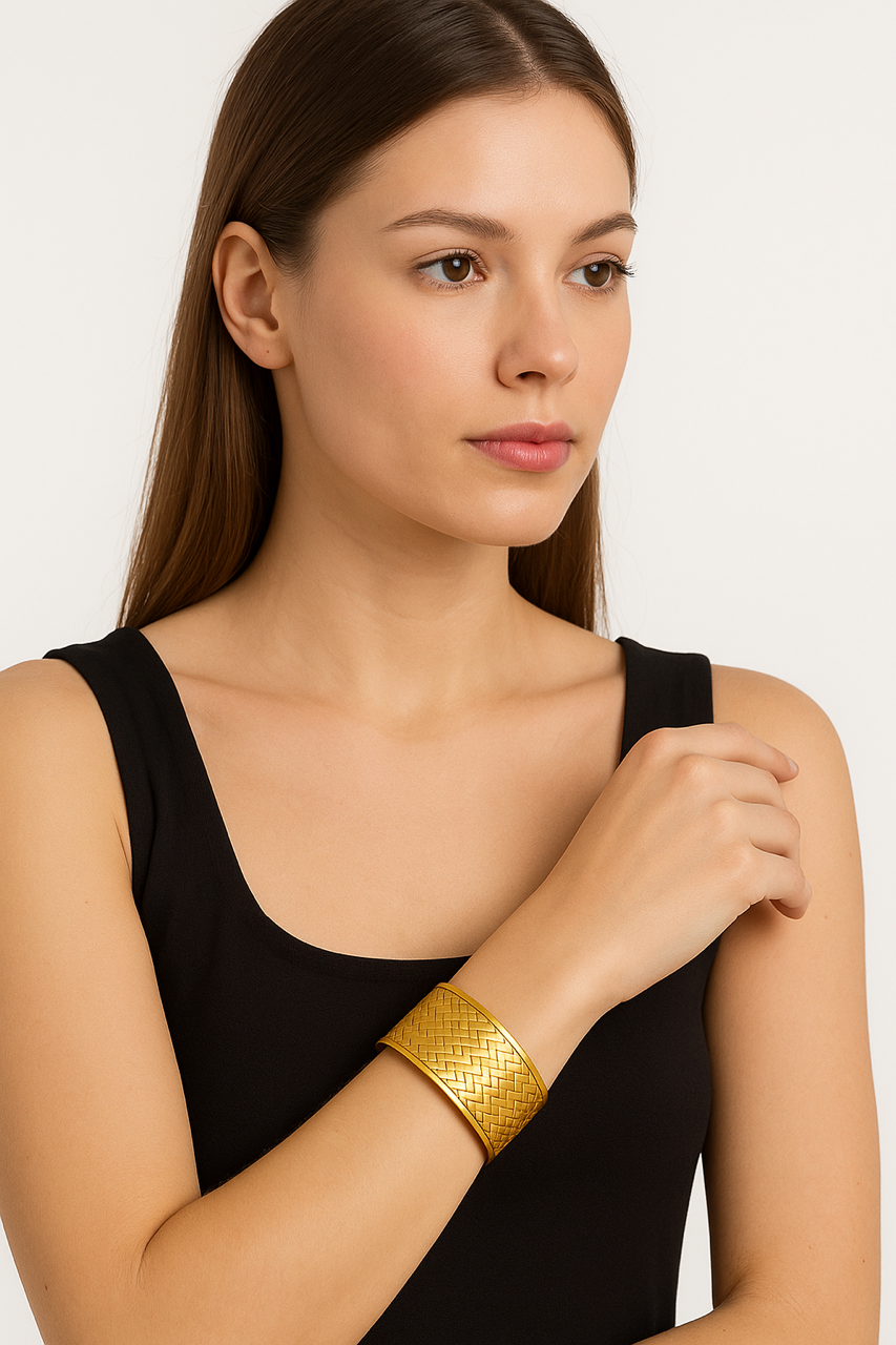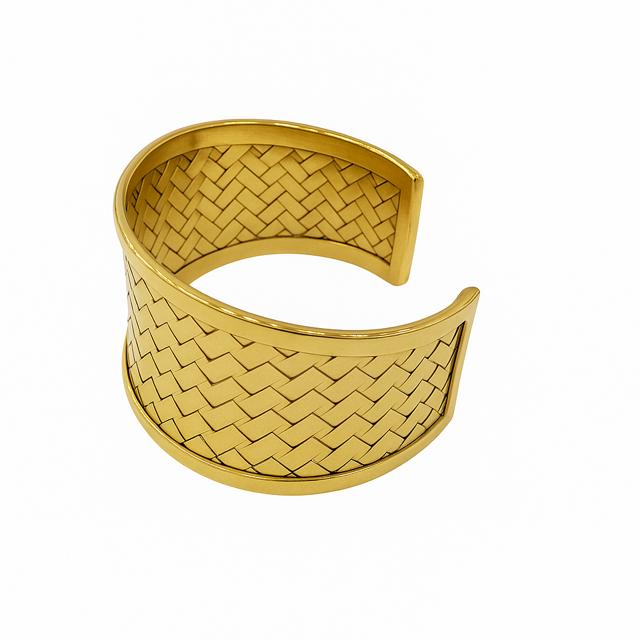 Δώστε χαρακτήρα στην εμφάνισή σας με αυτό το εντυπωσιακό χρυσό cuff βραχιόλι, εμπνευσμένο από την παραδοσιακή πλεκτή υφή. Με έντονο γεωμετρικό μοτίβο και στιβαρό σχεδιασμό, αποτελεί ιδανική επιλογή για όσες θέλουν να ξεχωρίζουν με μία μόνο πινελιά. Το λαμπερό φινίρισμα σε συνδυασμό με την ανάγλυφη υφή δημιουργούν μια δυναμική αντίθεση που μαγνητίζει τα βλέμματα.