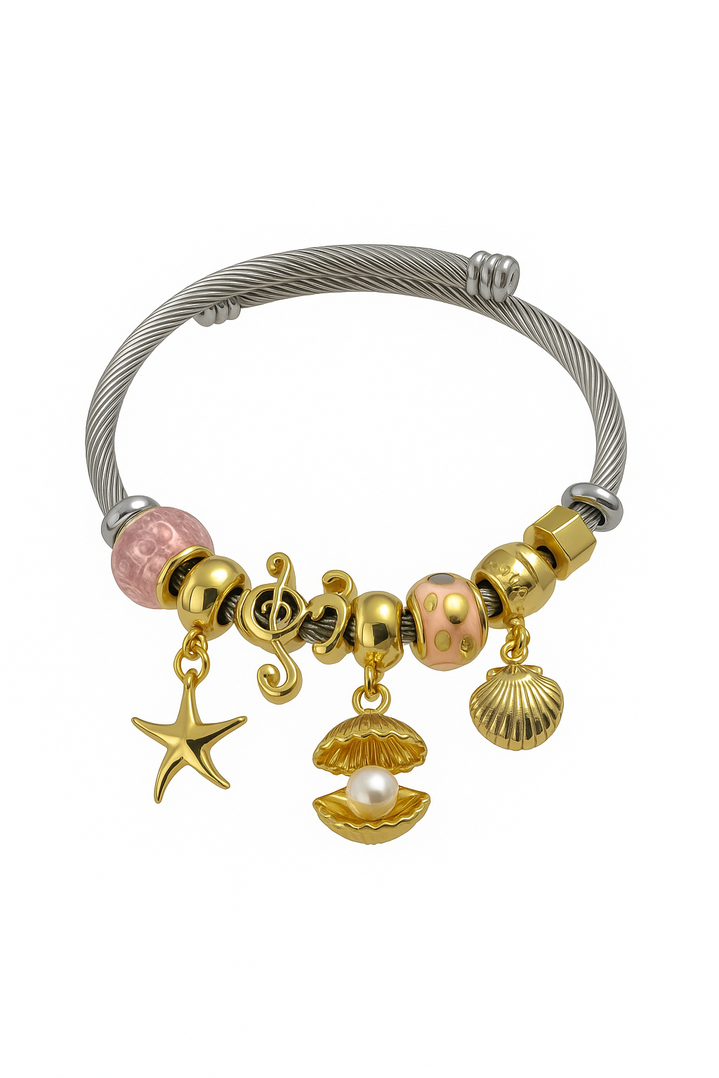 Ένας υπέροχος συνδυασμός από ροζ γυάλινες χάντρες, επίχρυσα charms και εμβληματικά στοιχεία όπως κοχύλι με πέρλα, αστερίας και μουσική νότα.