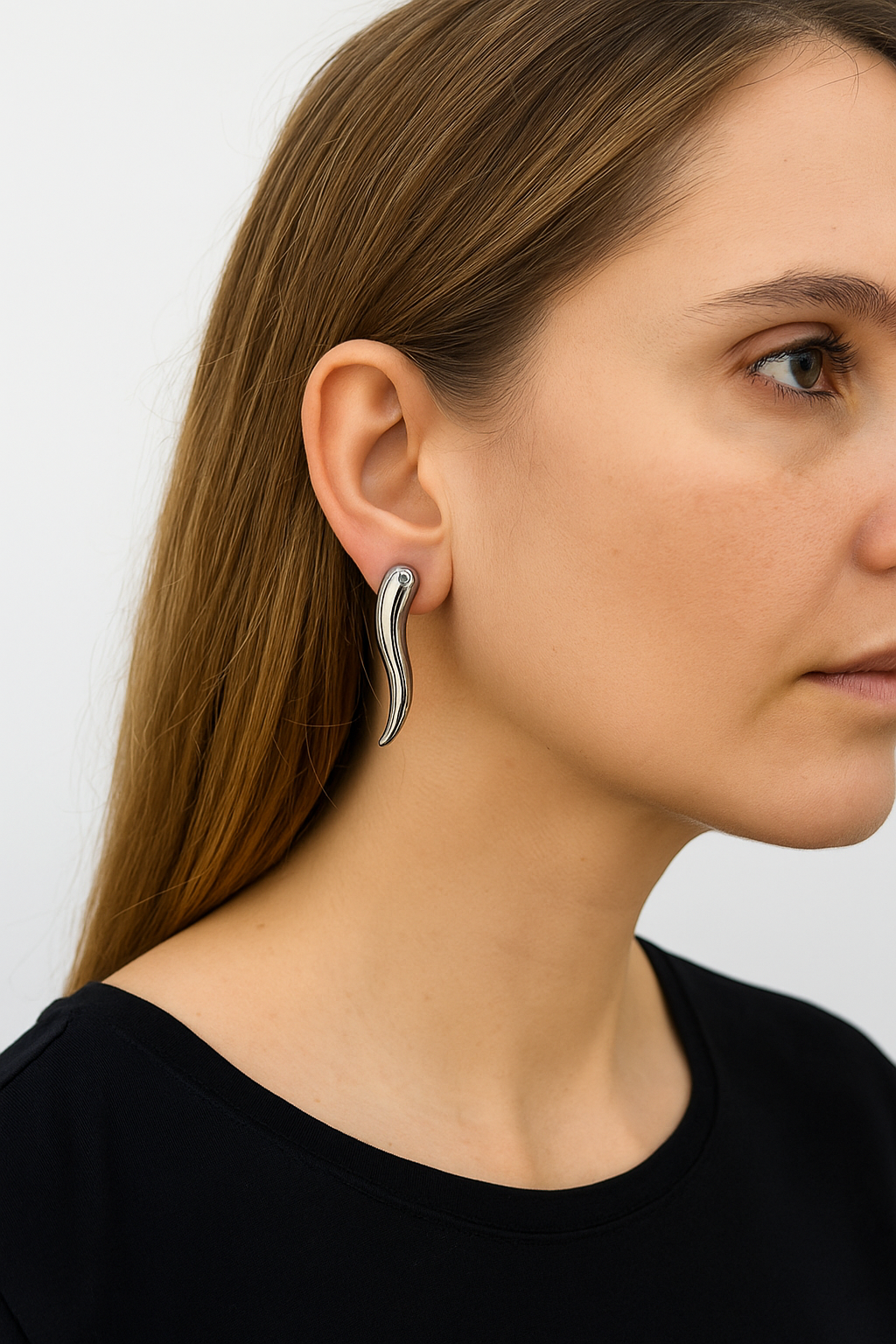 Εντυπωσιακά σκουλαρίκια από ανοξείδωτο ατσάλι σε κυματιστό σχέδιο, που προσδίδουν δυναμισμό και κομψότητα σε κάθε εμφάνιση. Το μοντέρνο τους σχήμα αγκαλιάζει διακριτικά το αυτί, δημιουργώντας μια statement πινελιά χωρίς υπερβολή.