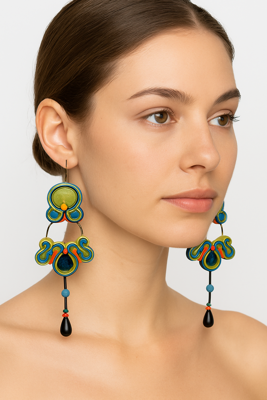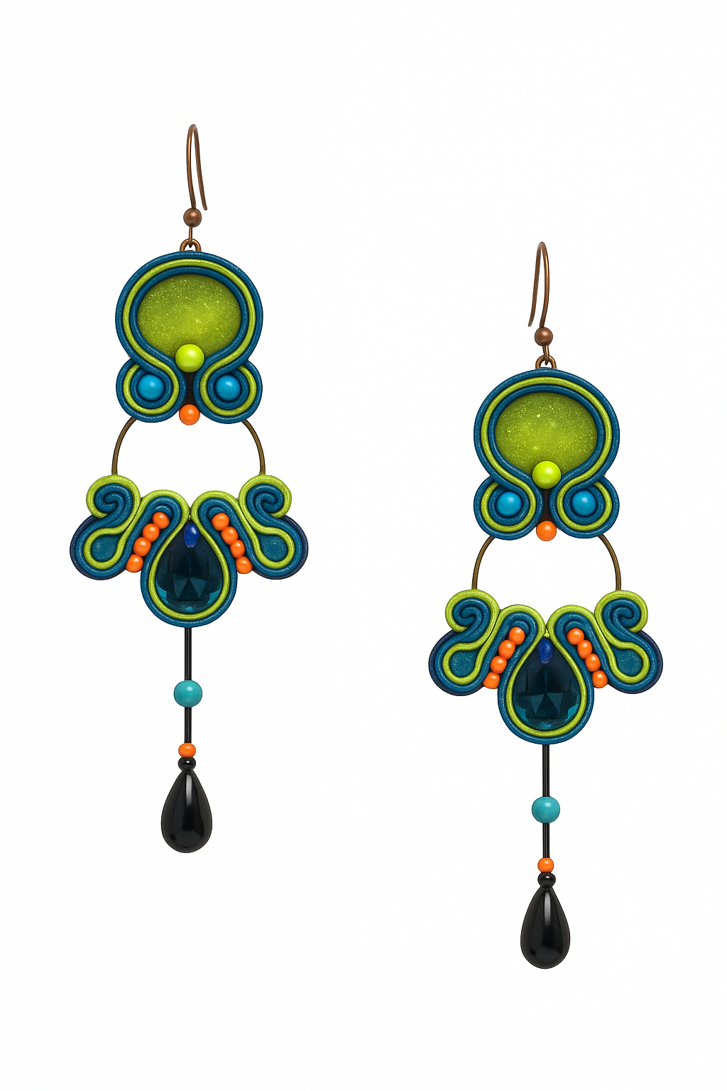 Ένα μοναδικό κόσμημα φτιαγμένο με την παραδοσιακή τεχνική soutache, που συνδυάζει πολυτελή κορδόνια, ημιπολύτιμες πέτρες και καλλιτεχνική λεπτομέρεια. Κάθε κομμάτι είναι αποτέλεσμα αγάπης, υπομονής και δημιουργίας, σχεδιασμένο για να προσθέτει χρώμα, στυλ και χαρακτήρα σε κάθε σας εμφάνιση.