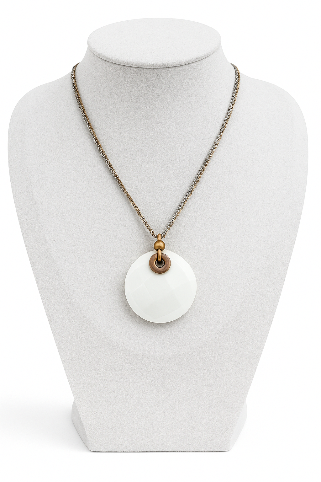Το “VKLusso Eclipse” είναι ένα statement κολιέ που συνδυάζει την απλότητα με την αρχιτεκτονική αισθητική. Το στρογγυλό μενταγιόν από γυαλιστερή λευκή ρητίνη με κομψές γεωμετρικές γωνίες αποπνέει καθαρότητα, ενώ οι μεταλλικές αντικέ λεπτομέρειες και η διπλή αλυσίδα σε bronze & ασημί αποχρώσεις προσθέτουν διακριτικό ρετρό χαρακτήρα.